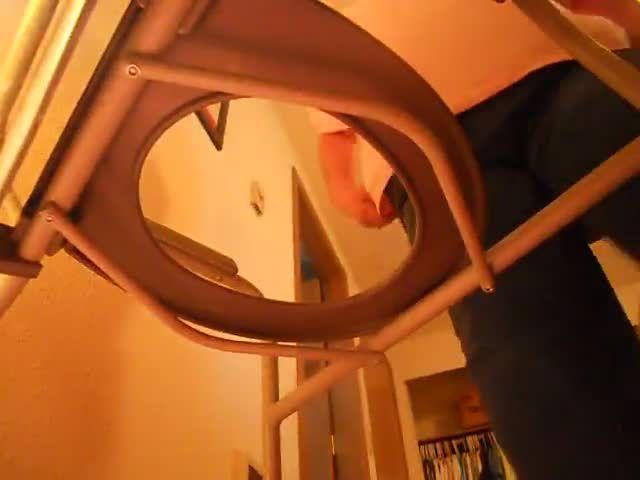 Fat woman sitting half naked on a homemade toilet while pooping and peeing.