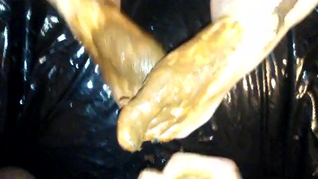 Sexy girl decides to pleasure her boyfriend in an unique way. She smears fresh shit on her legs while she gives him a fast feetjob.