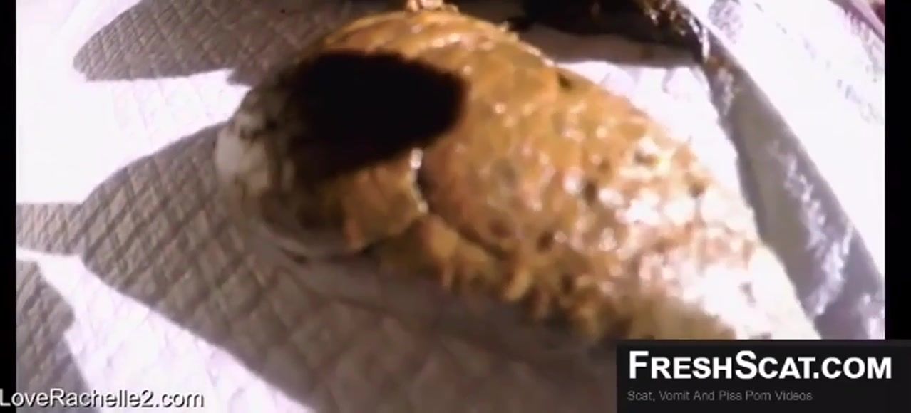 teen sits on her knees and she's fingering her tight pussy hard. She struggles to push a big turd out.