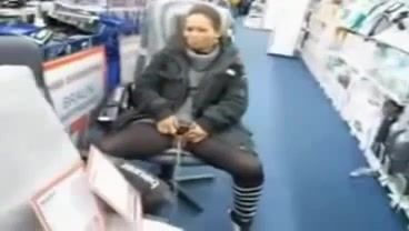 Blonde milf flashing her pussy in a supermarket before peeing with pressure.