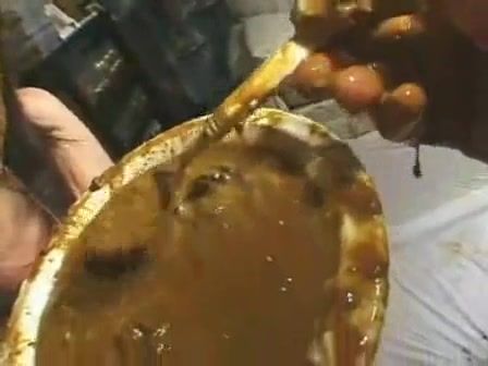 Japanese girl sits on her knees while her boyfriend is forcing her to eat poop with a metallic spoon.