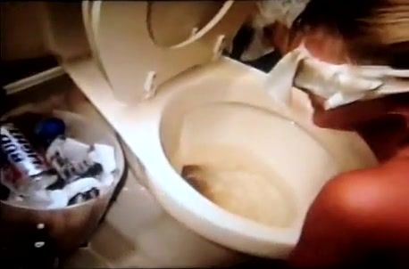 Blonde woman forced by a younger guy to eat fresh shit from a toilet. He slapped her ass a couple of times.