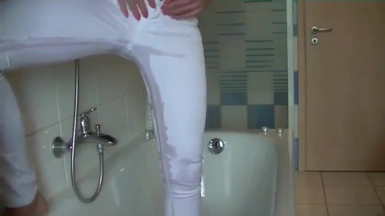 German girl decides to poop and pee a lot in white pants. She's amazing at teasing with her long legs.