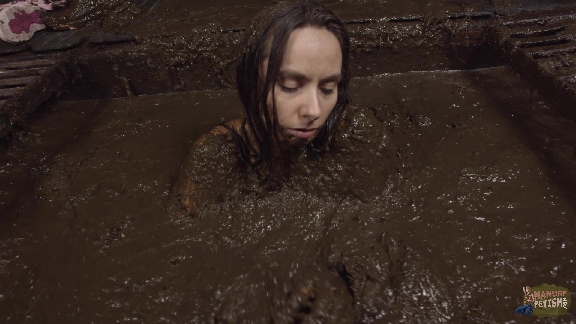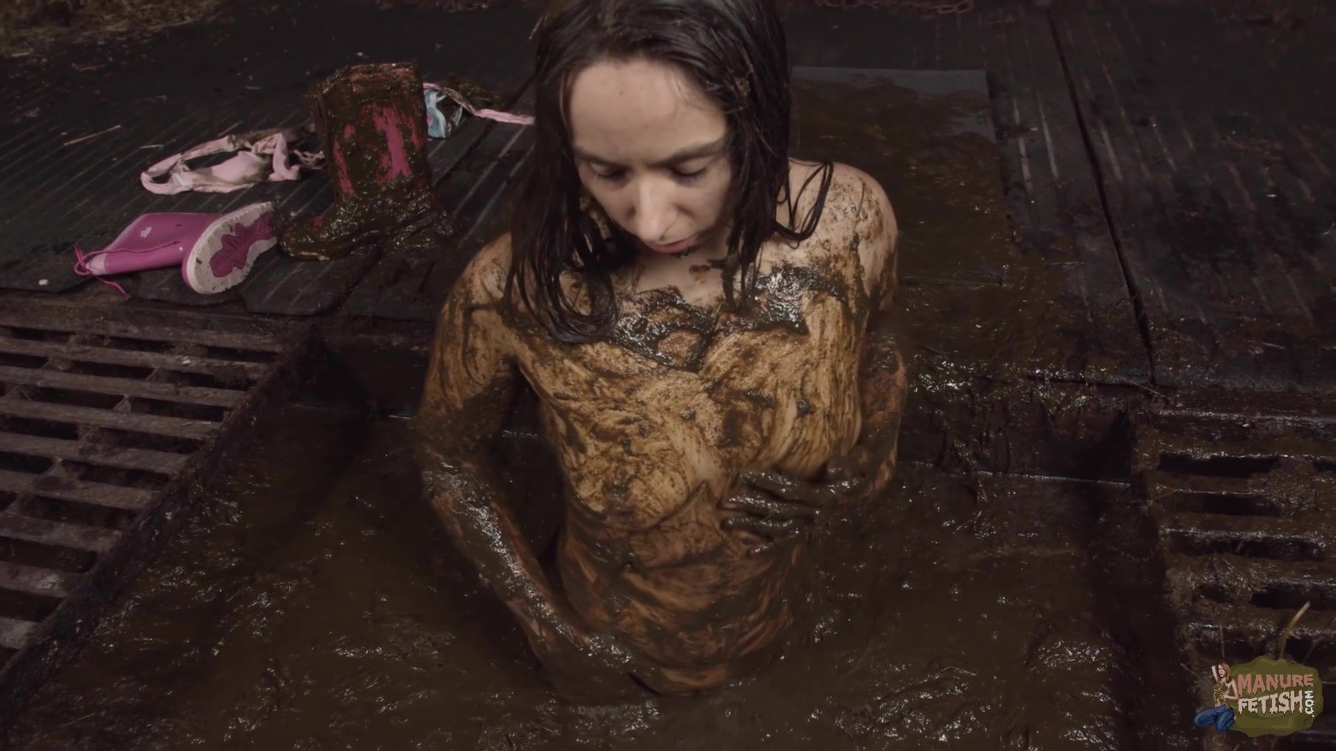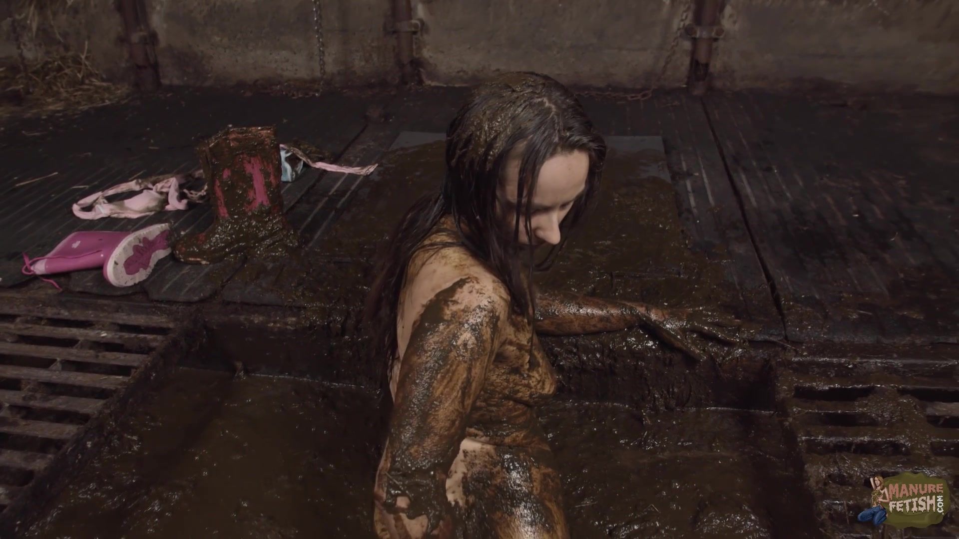 Sexy girl covers herself completely in cowshit and masturbates in the manure channel.