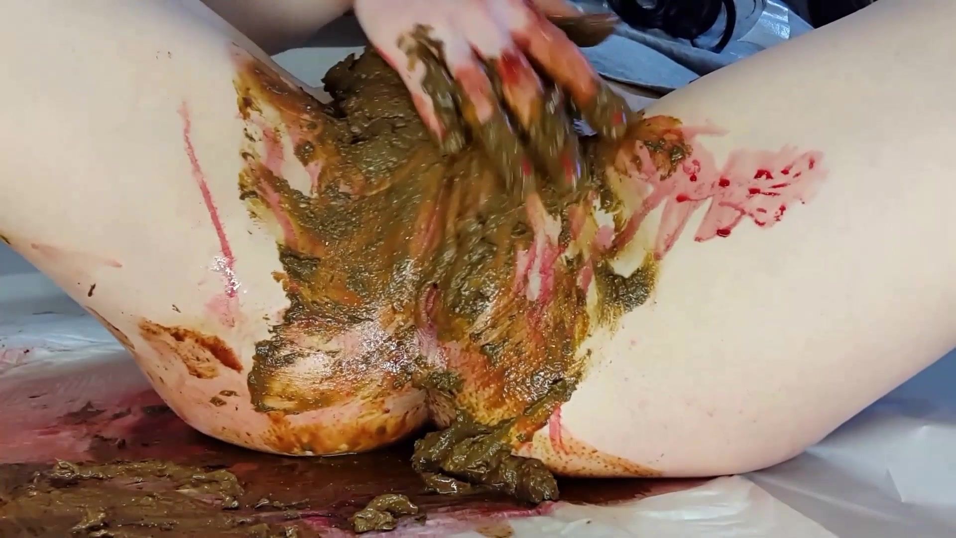 Dark haired teen is on her period and she masturbates with brown poop in front of the camera.