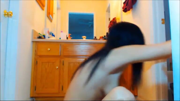 Girl with long blue hair playing with shit in bathroom