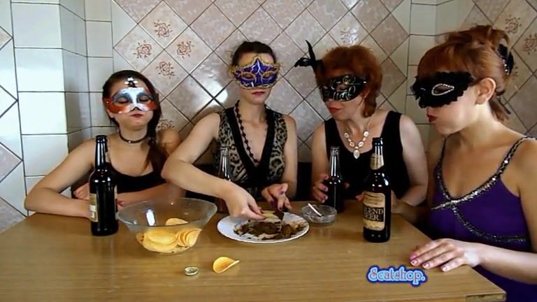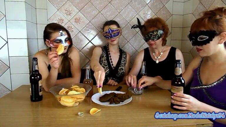 Girls in masks share a plate of shit and chips