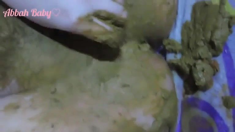 Green haired babe smears poop on her pussy. She's using a dildo to masturbate until cumming.