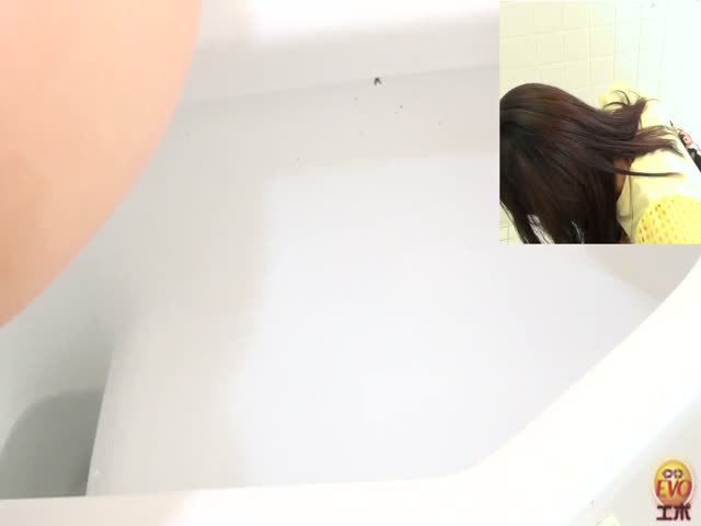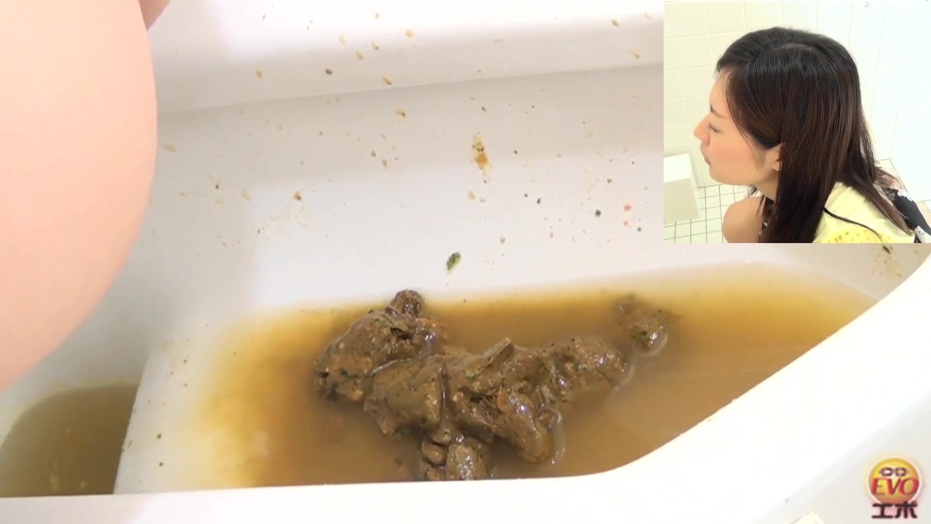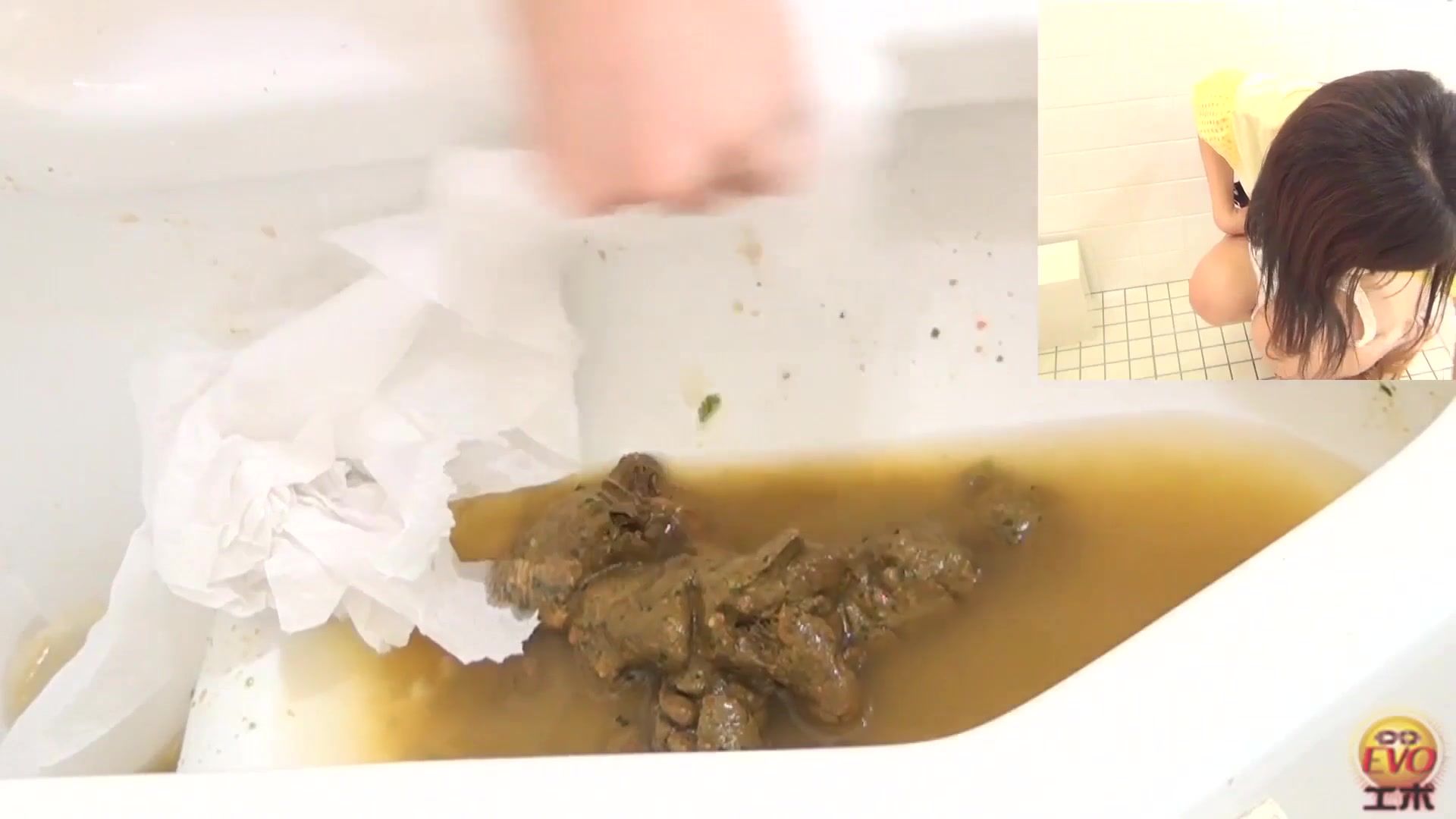 Brown haired japanese girl dropped a big pile of shit in a public bathroom.