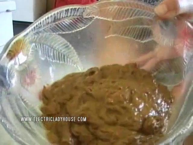 Hairy wife shits a lot in a glass bowl. She plays with her own poop as she smears it on her hands.