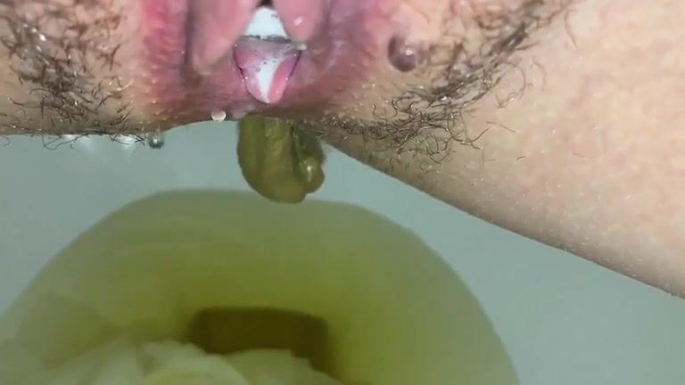 Hairy babe takes a big turd in her mouth. She's sucking it hard.