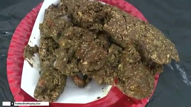Hairy brunette shits on white plate
