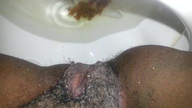 Ebony babe records her hairy pussy and ass in close up while she's pooping diarheea over the toilet.