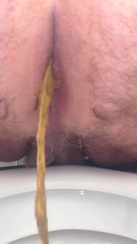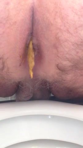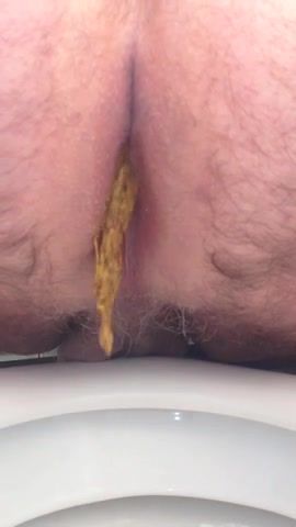 Hairy guy takes a shit in toilet while he records his ass in close up.