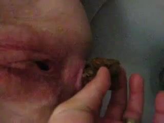 Sexy girl pooping a hard turd on her hands cause she wants to smear it on her body, later on.