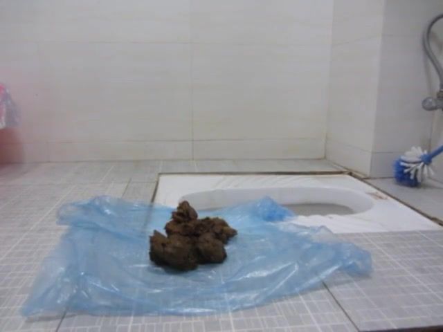 Dark haired Asian girl is having fun with fresh poop. She smears it on her feet.