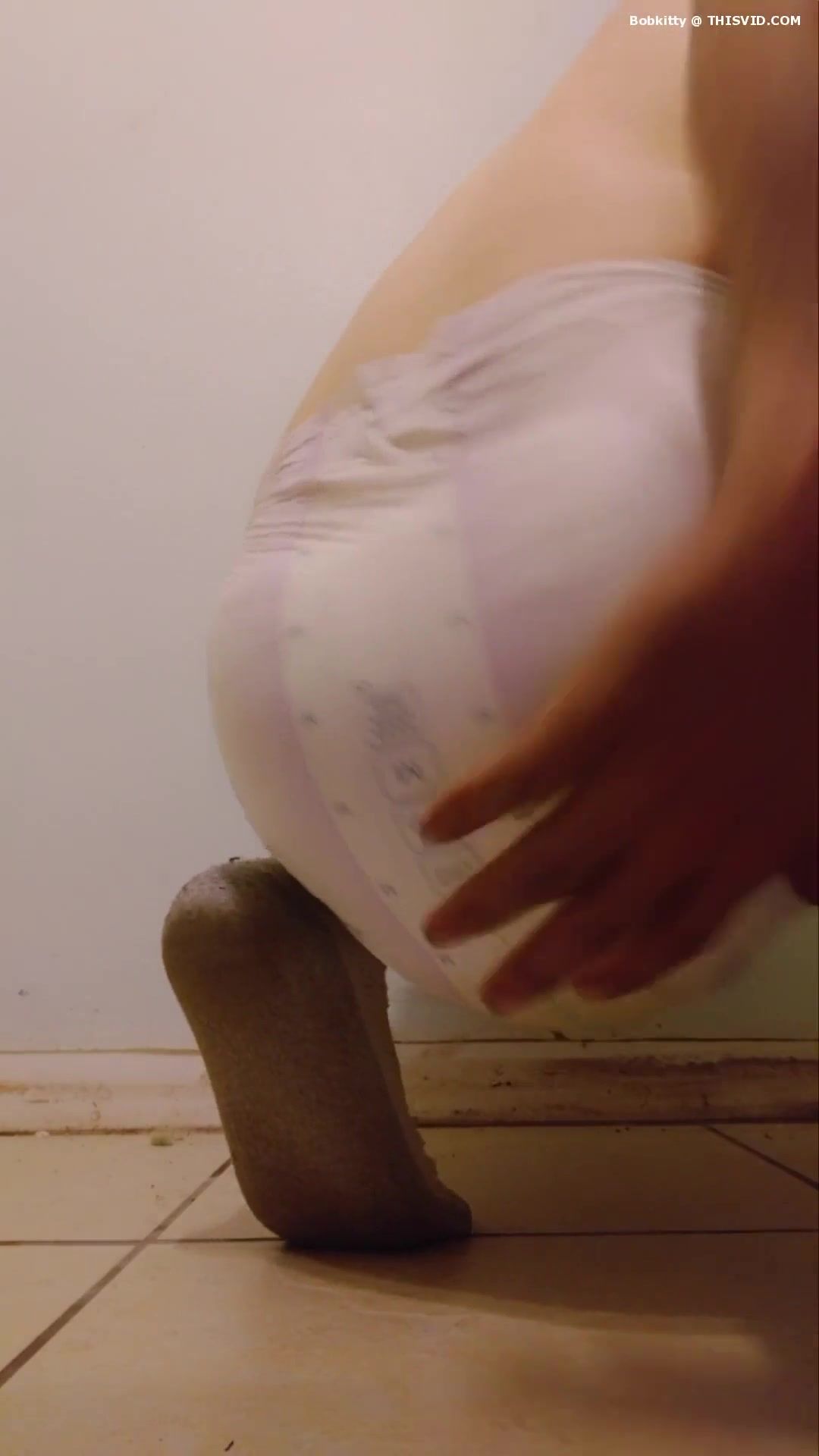 He sits naked on his knees and he's pooping a lot in white diapers. He's jerking off with shit.