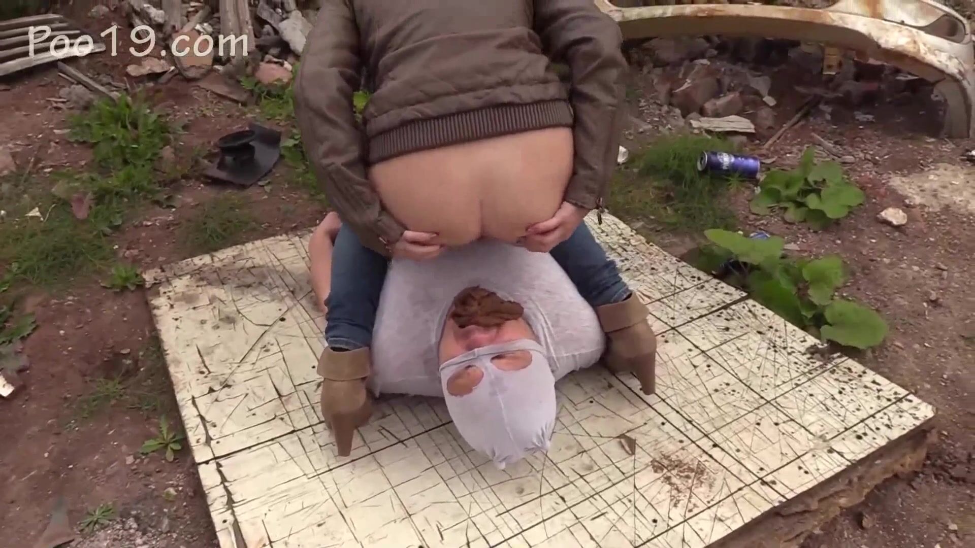 Skinny teen girl poops on fat slave