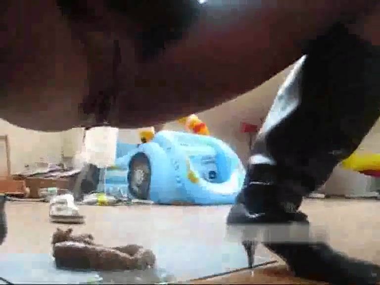 Hot black girl that's wearing black lace lingerie and black latex boots is shitting on bedroom floor.
