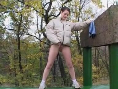 Amateur brunette is peeing with pressure in the middle of a forest.
