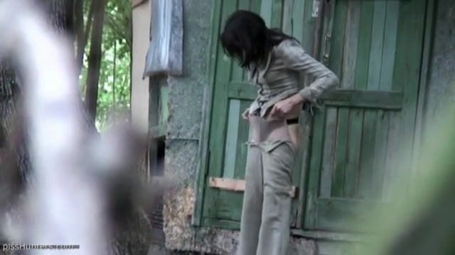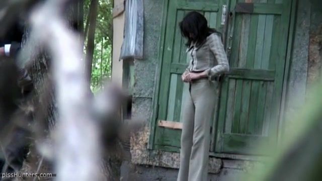 Hot brunette secretary caught peeing outdoor. She undressed slowly to pee behind a wooden barn.