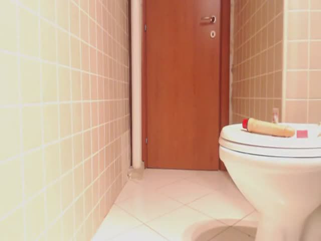 Hot brunette sitting half naked on her knees, on bathroom floor. Sexy babe finished masturbating with a long dildo. She's licking that poop from it.