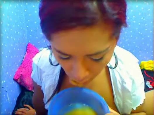 Hot girl working on a webcams website while she's pooping in a blue lunch box.