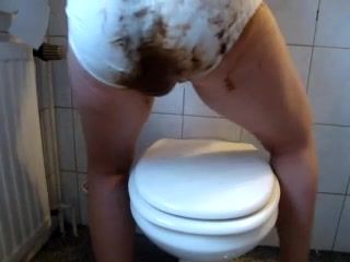 Chubby wife is pooping in her white diapers. She smears that shit on her entire body, awesome.