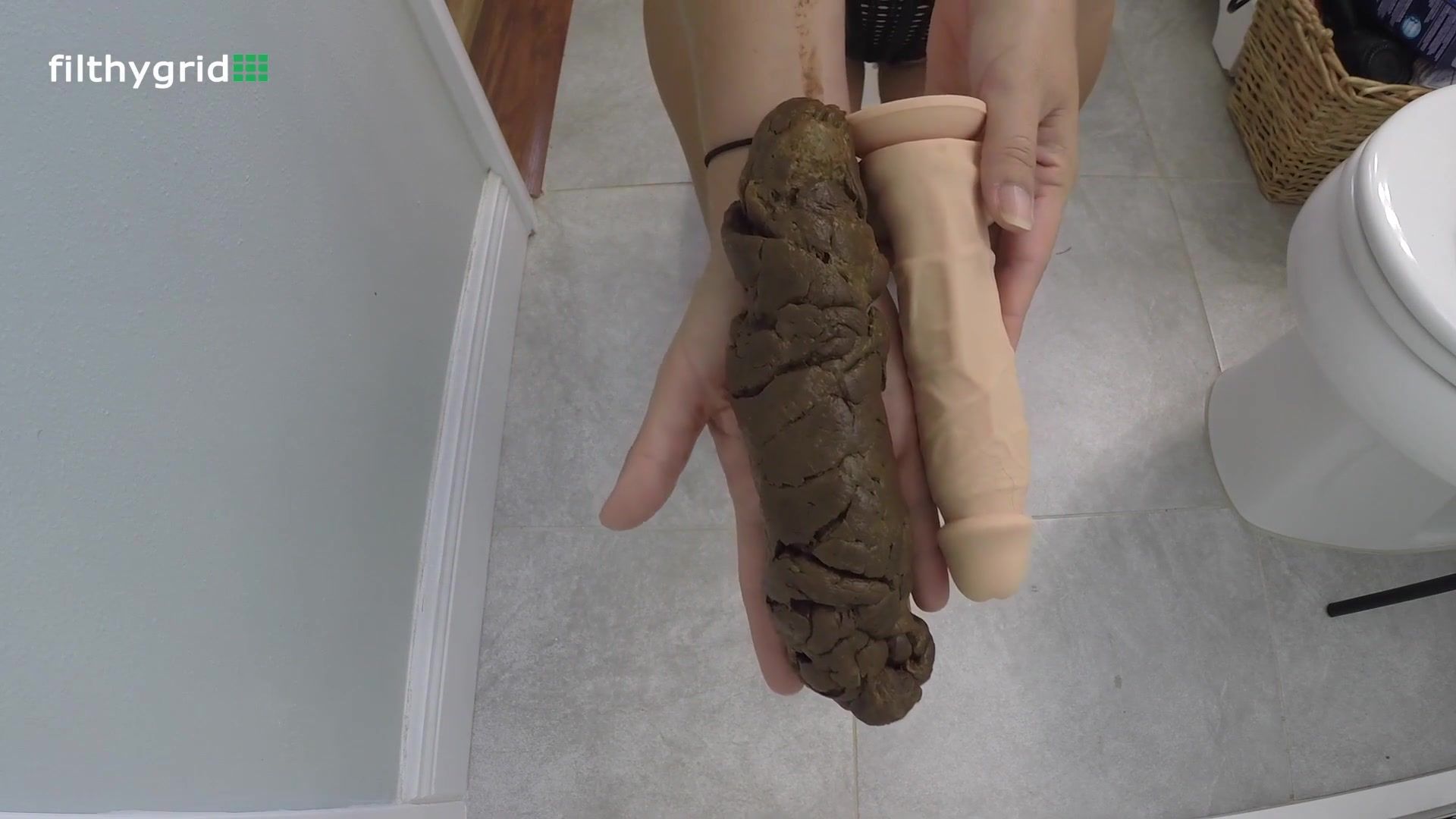 Nerdy babe is pushing a very big turd form her sexy ass. She starts masturbating while smearing poop.