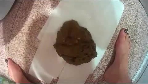 Amateur girl dropepd a very big pile of shit on bathroom floor. It looks delicious and she wants to eat all that shit.