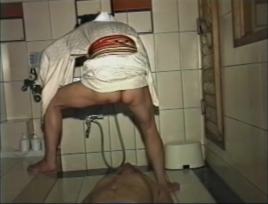 Japanese geisha is pooping on a random guy, feeding him with fresh shit.