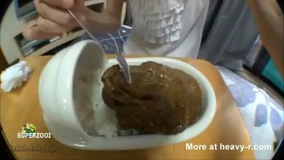 Japanese teen eating poop from a white plate