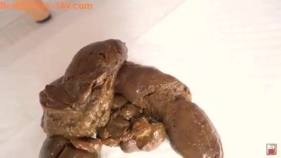 Dark haired japanese girl is pooping a lot on bathroom floor after she pulled her white panties down.
