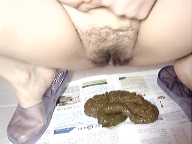 Hot Korean chick with hairy pussy pooping on the newspaper