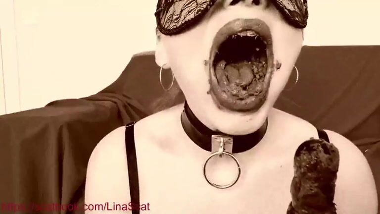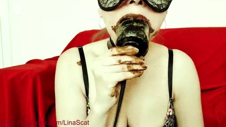 Latex slut masturbates while eating shit