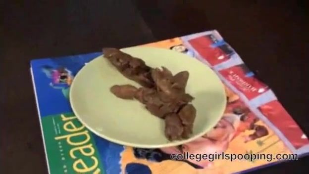 Brown haired teen is pooping a big pile of shit on a plate. She's laughing and having fun.