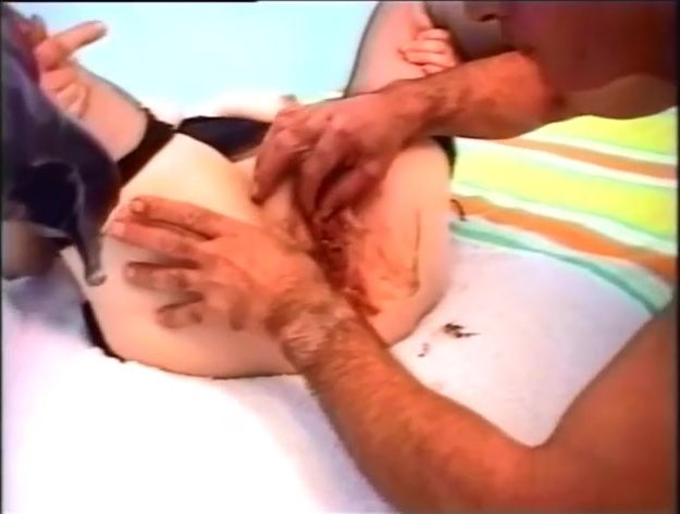 Middle aged guy sits on his knees while he's licking his girlfriends pussy. She smears fresh shit on it…while he's trying to clean it with his tongue.