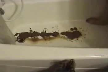 Amateur girl pooping liquid shit with pressure in bathtub. She's smearing that poop on her naked body.