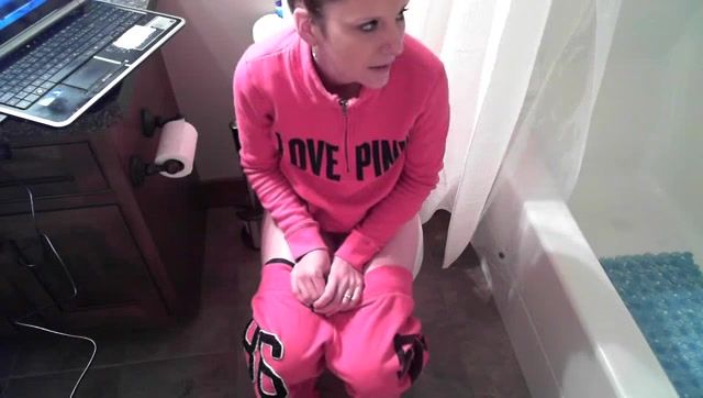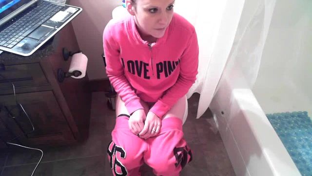 Teen girl pooping in the bathroom while she's listening music. She's relaxed and she's wearing pink pijamas.