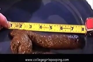 Brown haired teen dropped a very long brown turd on a white plate. She was very impressed about it.
