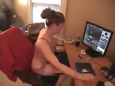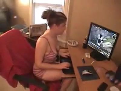 Skinny girl sits at the desk on the computer…she's trying to find a good movie to watch in a Saturday evening…
