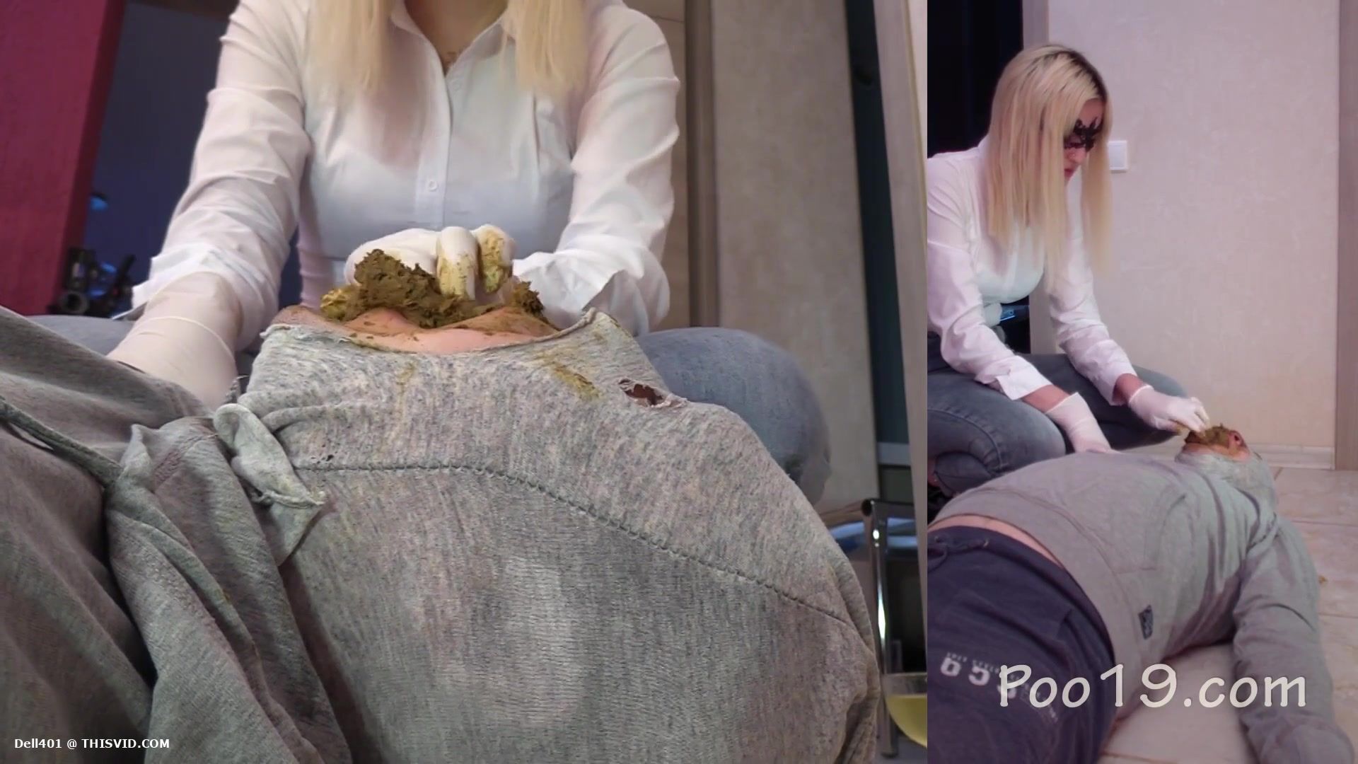 Masked blonde decides to feed her male slave with a big pile of poop. She forced him to swallow it all.