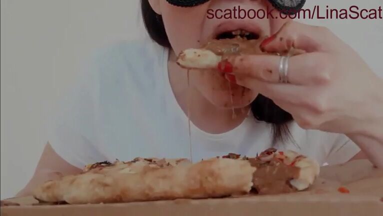 Masked brunette girl poops and eat