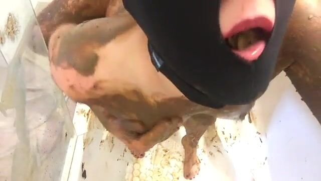 Maked slut holding shit in mouth