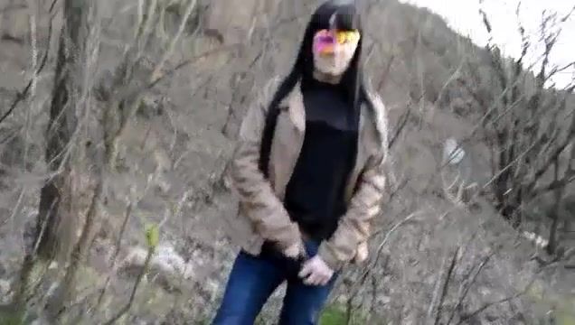 Brunette masked teen eating fresh shit in the middle of a forest. She lets her best friend to record her while eating poop.
