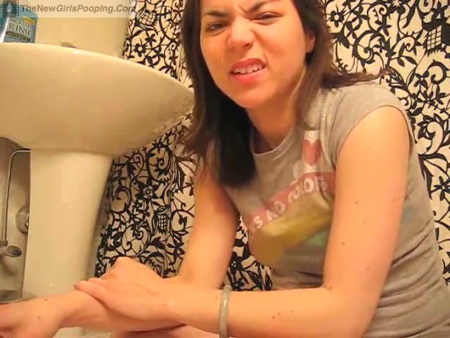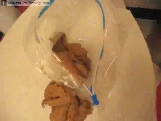 Brown haired girl is pooping a big turd in a plastic bag…while the toilet was one meter away from her…