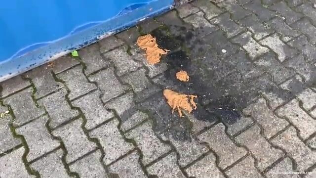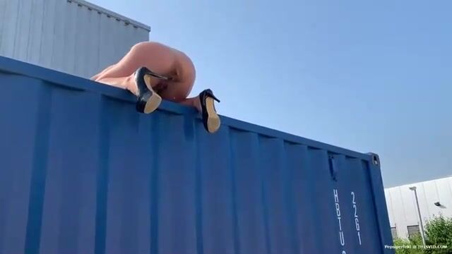 Naked blonde shit from the roof of a container