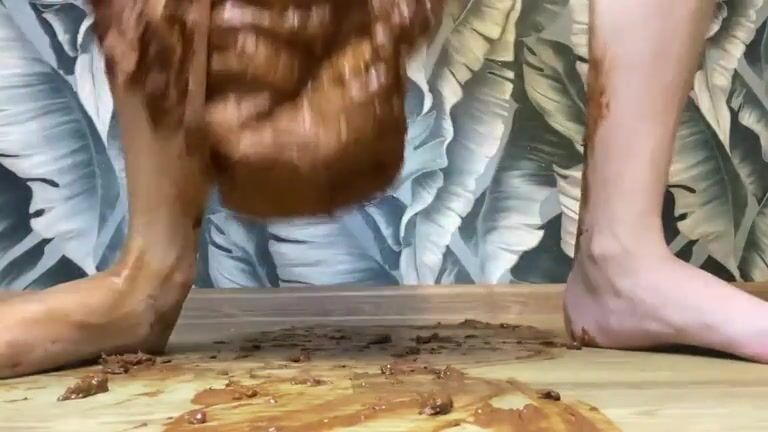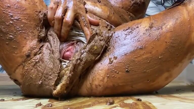 Nasty brunette smearing hot shit on her body