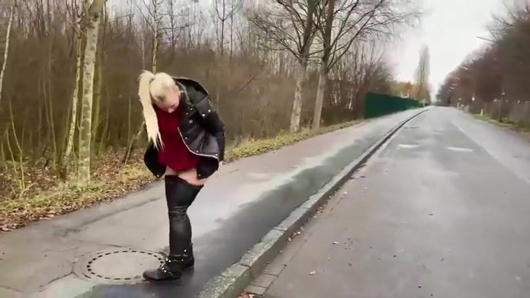 Naughty blonde lady poops on the road