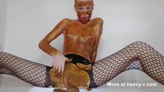 Blonde babe smears poop on entire body. She starts fingering her pussy hard.